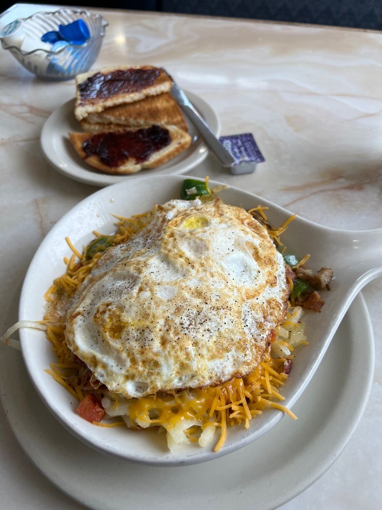 Hash, green peppers & onions. Consuming raw or undercooked meats, poultry, seafood, shellfish or eggs may increase your risk of foodborne illness.
