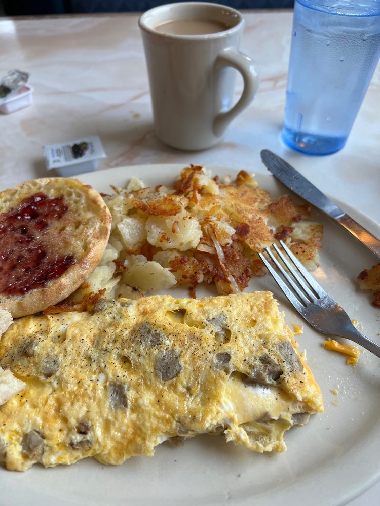 Eggs, with your choice of bacon, sausage, or ham topped with cheese on an English muffin & hashbrowns..